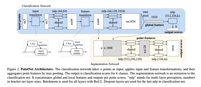 기존의 Voxel 혹은 다중 뷰 접근법과 달리 원시 점 데이터를 그대로 사용하고, 입력 점들의 순서에 관계없이 동일한 결과를 출력하는 네트워크 구조 설계. 전역 특징과 로컬 특징을 결합하여 segmentation, object detection, clustering에서 높은 성능 달성. 핵심 method : 대칭 함수 사용, T-net을 사용하여 affine 변환 학습