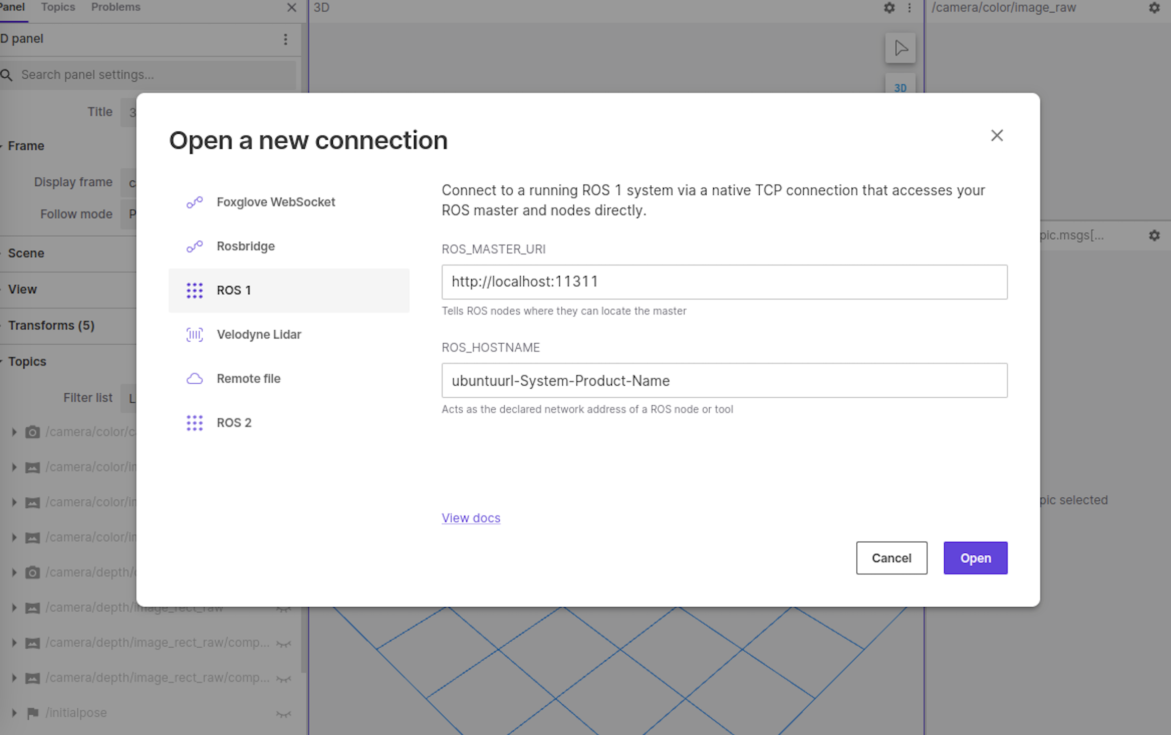 이 화면을 같은 와이파이 내에 있는 내 맥북에서 보고 싶으면, 맥북에서 https://studio.foxglove.dev/ 에 접속한 후