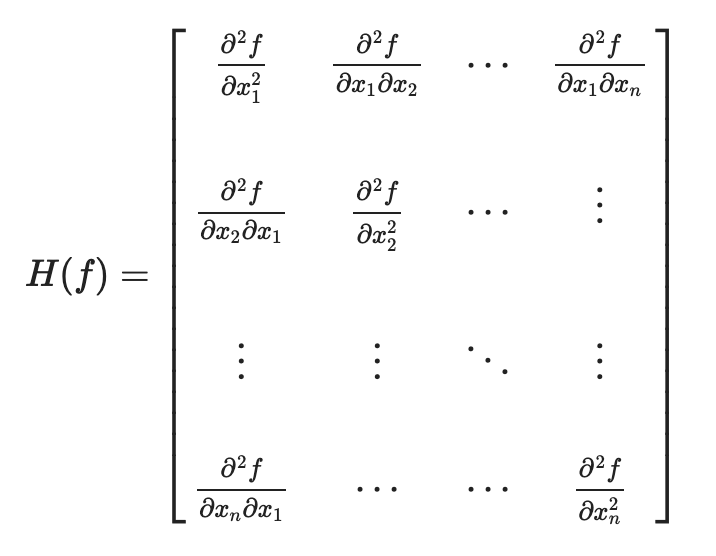어떤 함수의 2계 도함수들을 이용하여 만든 행렬. Symmetric matrix이다.