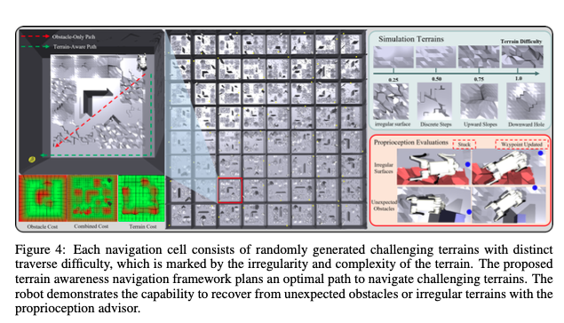 경로 계획기 내에서 우리는 로봇이 장애물을 효과적으로 피하면서 Traversability가 더 높은 지형의 경유점을 선택할 수 있도록 하는 Terrain estimator를 제시한다. 보행 제어기는 계획된 경유점을 추적하고 Proprioception advisor로서 동작을 평가한다. 폐루프 동작 피드백을 기반으로 우리는 시각 기반 지형 및 장애물 추정에 대한 온라인 correction을 제공한다.