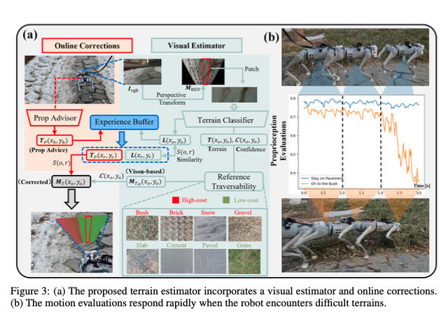 따라서 우리는 Motion evaluation에서 도축된 online correction으로 vision-only terrain estimator를 보완한다. 우리는 새로운 지형에 대한 Traversability score에 대한 정보를 전달하고 보이지 않는 장애물과 같은 예상치 못한 교란을 로봇에게 경고하기 위한 proprioceptive advisor를 구성하였다.