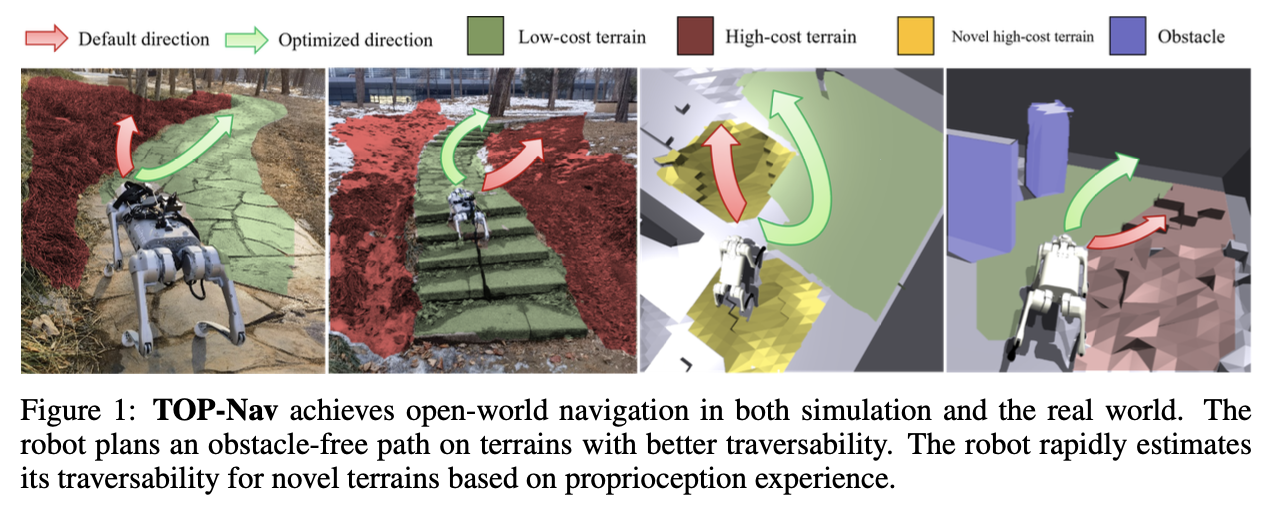 Terrain estimator, Obstacle estimator, Proprioception advisor를 통합함으로써 우리는 4족보행 로봇이 다양하고 도전적인 지형을 능숙하게 주행할 수 있는 계층적 경로 계획 및 운동 제어 프레임워크인 TOP-Nav를 제안한다. TOP-Nav에서는 이전에 수집된 데이터로부터 훈련된 terrain estimator를 개발하여 로봇에게 traversability를 알려 준다. 새로운 지형에 대해서는 예상치 못한 환경적 교란의 vision 기반 추정에 대한 온라인 보정을 제공하기 위해 proprioceptive history를 이용한다.