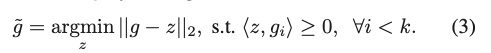 1) 새로운 θ가 θk-1에서 초기화되고 2) 각 최적화 단계에서 이전 작업들의 손실이 증가하지 않는 한 제약 조건이 만족된다는 것 을 관찰한다. 최적화 단계가 작다고 가정하면, 현재 작업과 이전 작업의 기울기 간의 내적을 계산해서 새로운 업데이트가 이전 작업의 손실을 증가시키는지 판단할 수 있다. 예를 들어 내적이 음수인 경우에만 이전 작업의 손실이 증가할 것이다. 그러면 최적화 문제는 (2)로 작성할 수 있다.