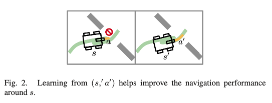 주어진 부최적 행동(suboptimal behavior) (s,a) ∈ Bstream에 대해, (s',a') ∈ Bstream에서 예시적인 훈련 데이터를 찾는 알고리즘 Ael. 이때 (s',a')로부터의 학습이 s에서의 내비게이션 성능을 향상시킴