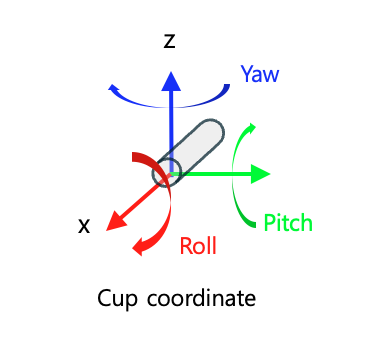 우선 물체 좌표계를 정의한다. 나는 기본적으로 컵이 로봇을 바라보는 방향으로 있다고 정의하고 여기서 돌리고 싶었다. 물체의 initial pose를 정의하지 않으면 문제가 더 복잡해지기 때문에 이렇게 가는 게 좋다.
