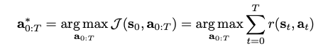 상태 St에서 행동 At가 주어졌을 때 Discrete-time dynamics St+1 = f(st, at)에 의해 제어되는 시스템을 고려해 보자. Trajectory optimization은 각 시간 단계별 보상 (또는 비용) r(st, at)로 분해된 목적 함수 J를 최대회 (혹은 최소화)하는 행동 시퀀스를 찾는 것을 의미한다.