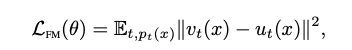 목표 확률 밀도 경로 pt(x)와 그에 해당하는 벡터장 ut(x)가 주어졌을 때, 플로우 매칭(FM) 목적 함수는 다음과 같이 정의된다.