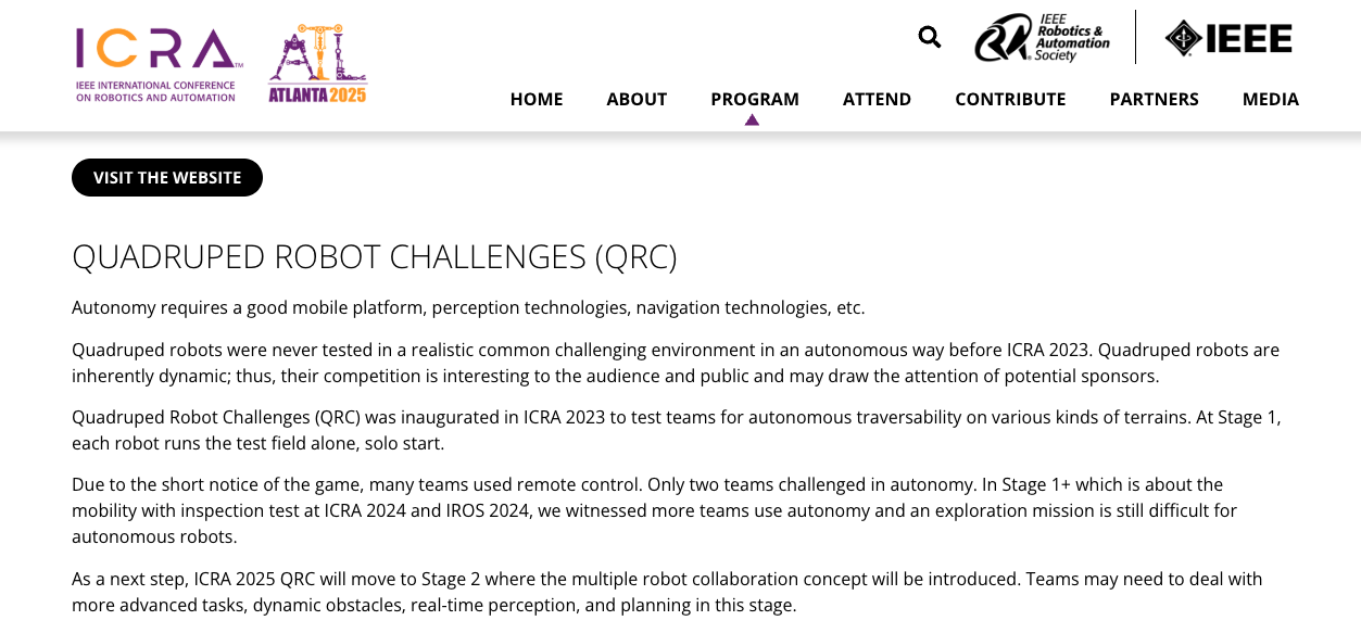 전세계 로봇 학회 중 가장 큰 학회 중 하나인 International Conference on Robotics and Automation (이하 ICRA)에서는 매년 사족보행로봇 챌린지(이하 QRC)라는 대회를 개최하곤 한다. 로보컵이나 DARPA처럼, 재난 상황에서도 잘 임무를 수행하는 로봇을 위한 기술을 개발하기 위해서 매우 도전적인 지형을 다니면서 미션을 수행하는 대회이다.