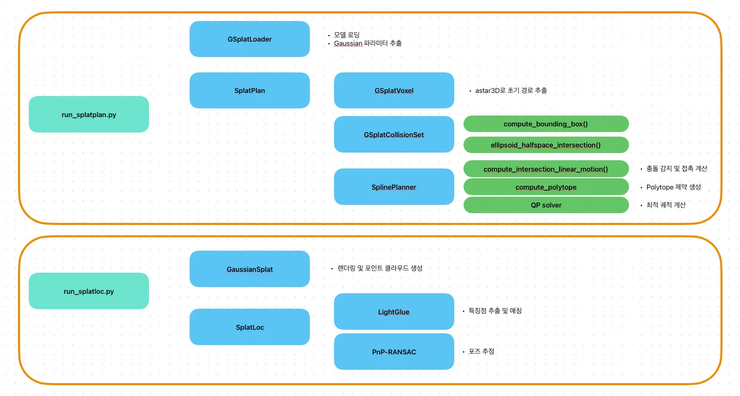 - 복셀 그리드: GSplatVoxel로 환경을 이산화하여 A* 경로 탐색에 사용