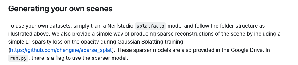 1. 환경 설정A. NerfStudio 설치SplatNav는 NerfStudio를 기반으로 작성되었다. https://github.com/nerfstudio-project/nerfstudio/tree/main GitHub - nerfstudio-project/nerfstudio: A collaboration friendly studio for NeRFsA collaboration friendly