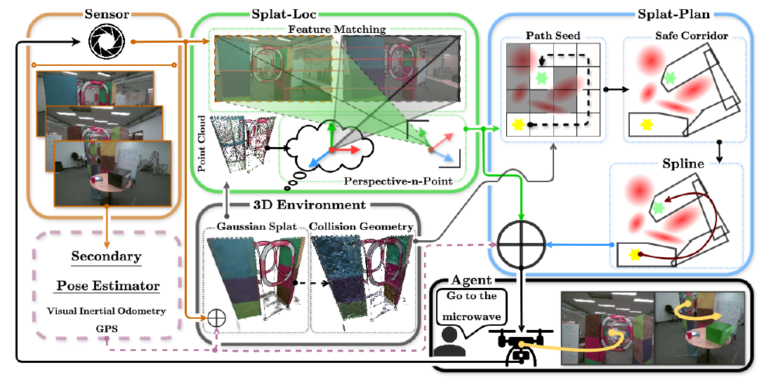 본 논문에서는 monocular camera 만을 사용하여 GSplat 지도 상에서 드론 내비게이션을 수행하는 파이프라인인 Splat-Nav를 소개한다. Splat-Nav는 경량화된 Localization 모듈인 Splat-loc과 계획 모듈 Splat-Plan으로 구성되며, 이는 RGB 카메라 영상만으로 안전한 내비게이션을 가능하게 한다.
