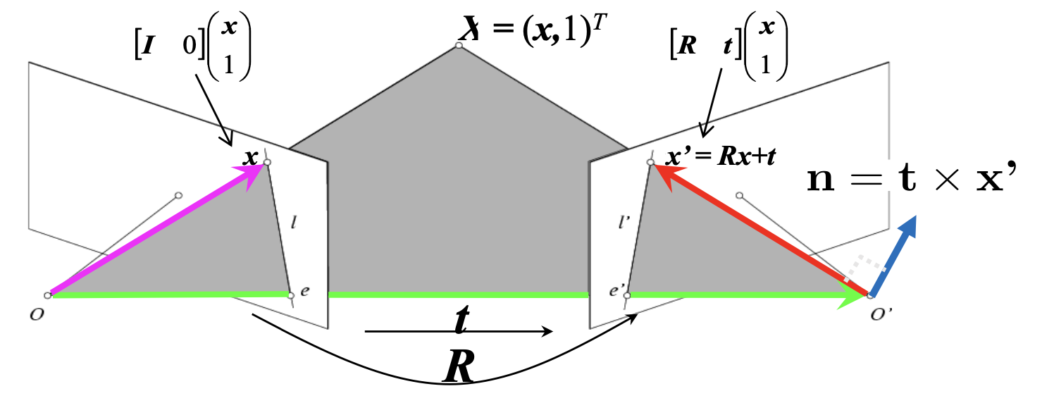 위 이미지에서 회색 영역으로 표시된 부분이 Epipolar Plane 입니다. 벡터 x, x', t 는 모두 Epipolar Plane 위에 있습니다.