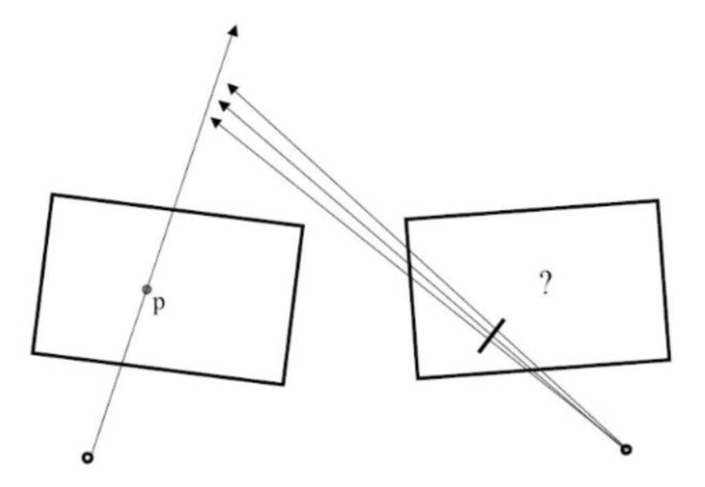 이때 Epipolar Geometry 에 의해서 , P 점에 대응되는 매칭점의 후보군은 Epipolar Line 위에서 찾을 수 있습니다.