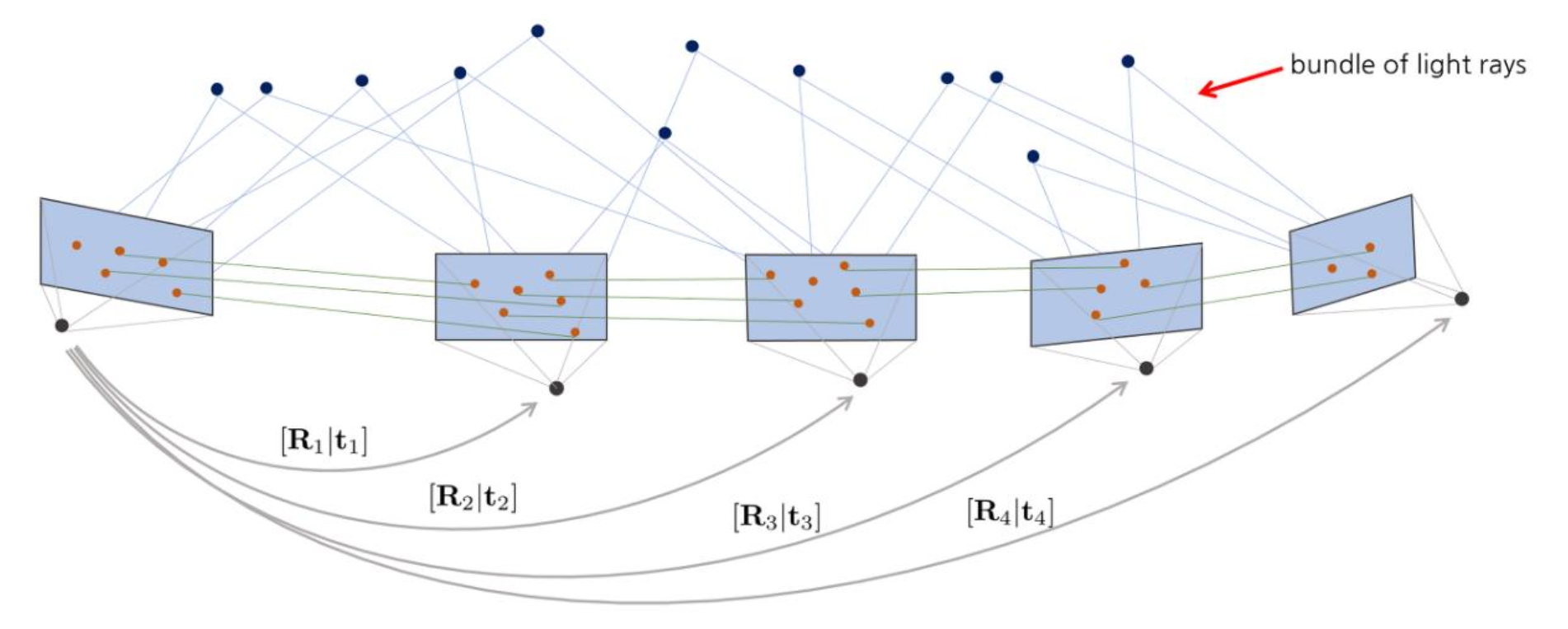 이때 문제가 되는 부분은, 여러 장의 이미지를 다루게 되면서 오차가 누적된다는 것입니다. 따라서 이 에러들을 한꺼번에 최소화할 수 있는 방법으로 나온 것이 Bundle Adjustment 입니다.