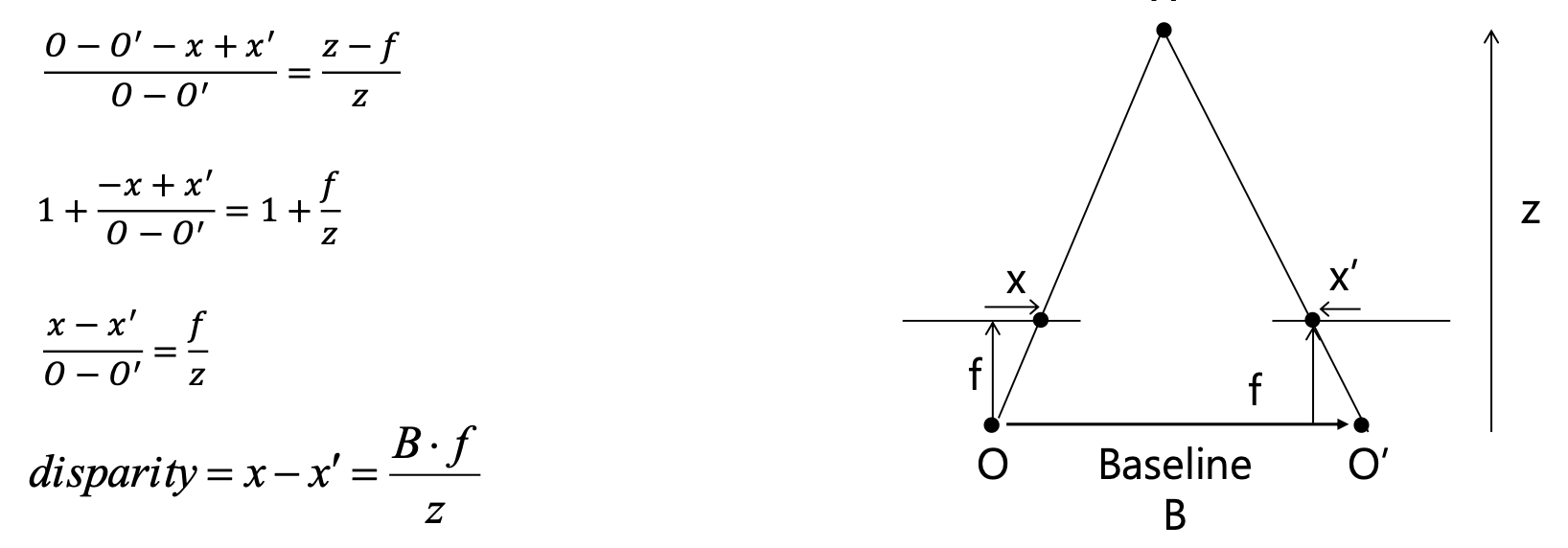 따라서 우리는 Triangulation 을 통해서 Disparity 를 이용해 Depth 를 계산할 수 있습니다.