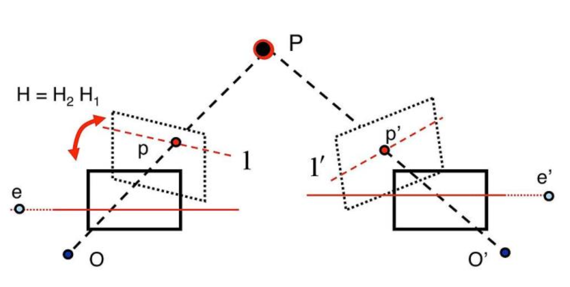 따라서 Epipole 을 무한으로 보내는 Homography 를 찾는다면 Image Plane 이 나란해지게 됩니다.