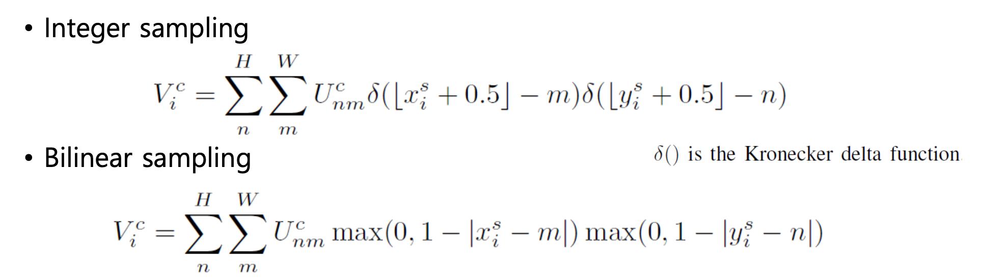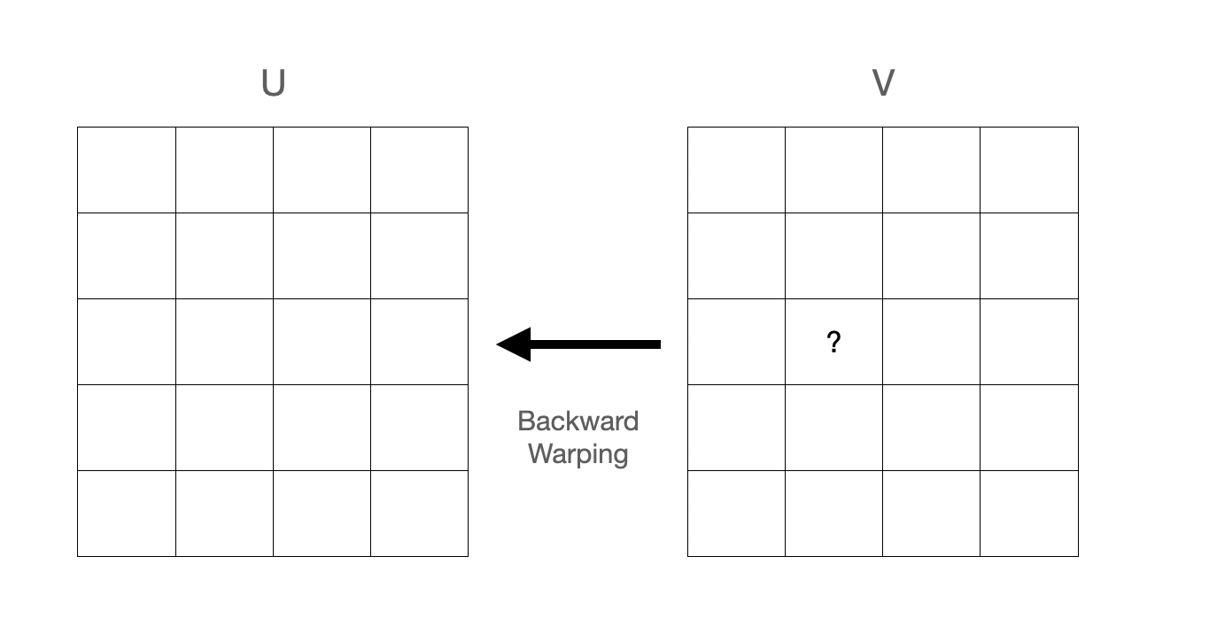 이때 forward warping 을 하지 않는 이유는 그렇게 되면 최종 결과물에 공백이 생기기 때문입니다. Dense 한 결과를 얻기 위해서 backward warping 을 하고, V 의 모든 그리드에 어떤 값이 들어갈 지 U 로부터 찾는 식으로 결과값을 얻습니다.