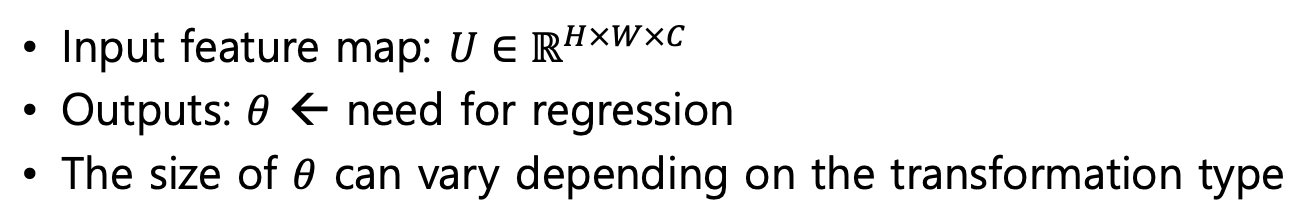 Localization net : feature 를 입력으로 받아 \(\Theta\) (파라미터)를 내놓음