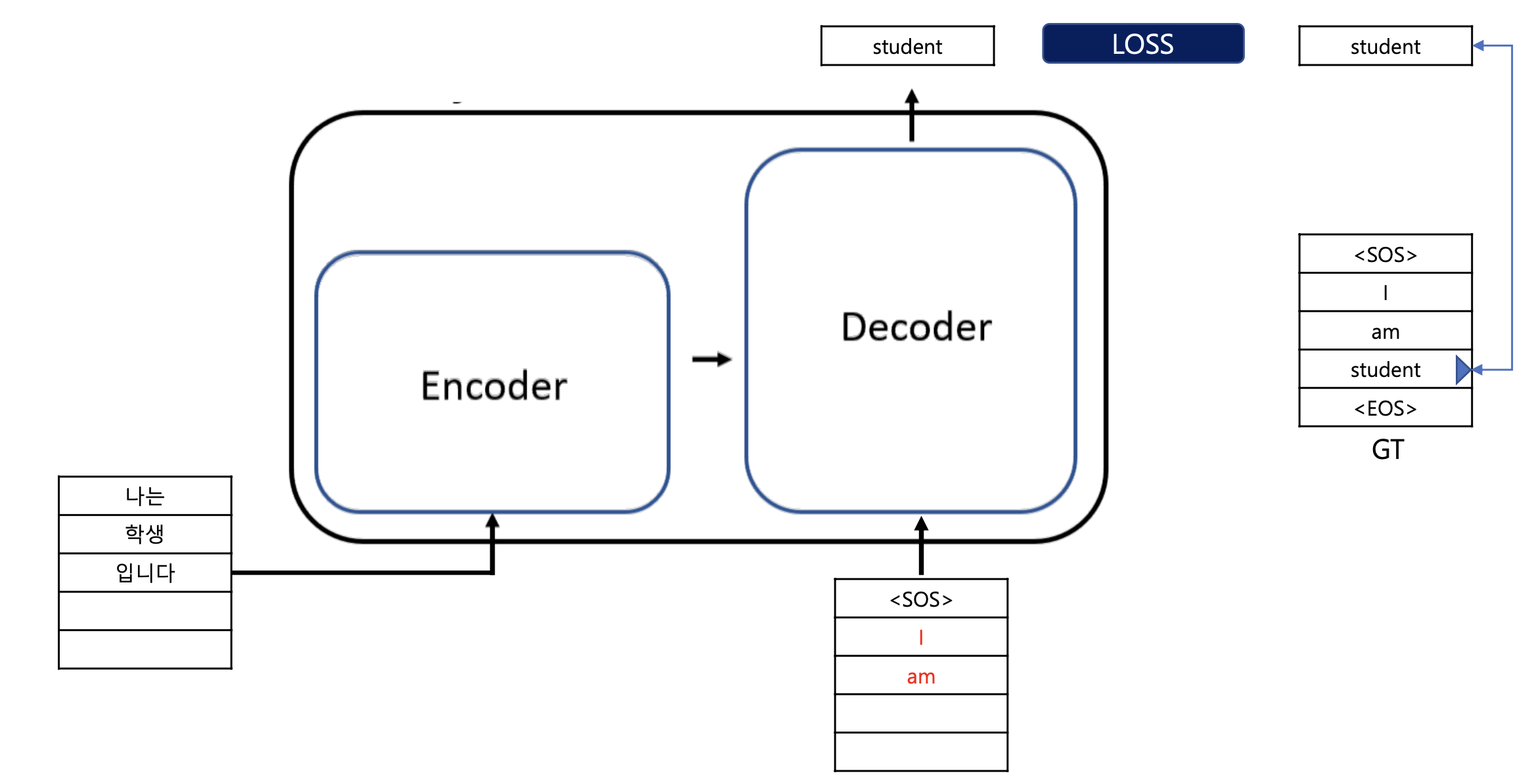 1. 우선 "나는 학생 입니다" 라는 문장을 인코더로 넣습니다.
