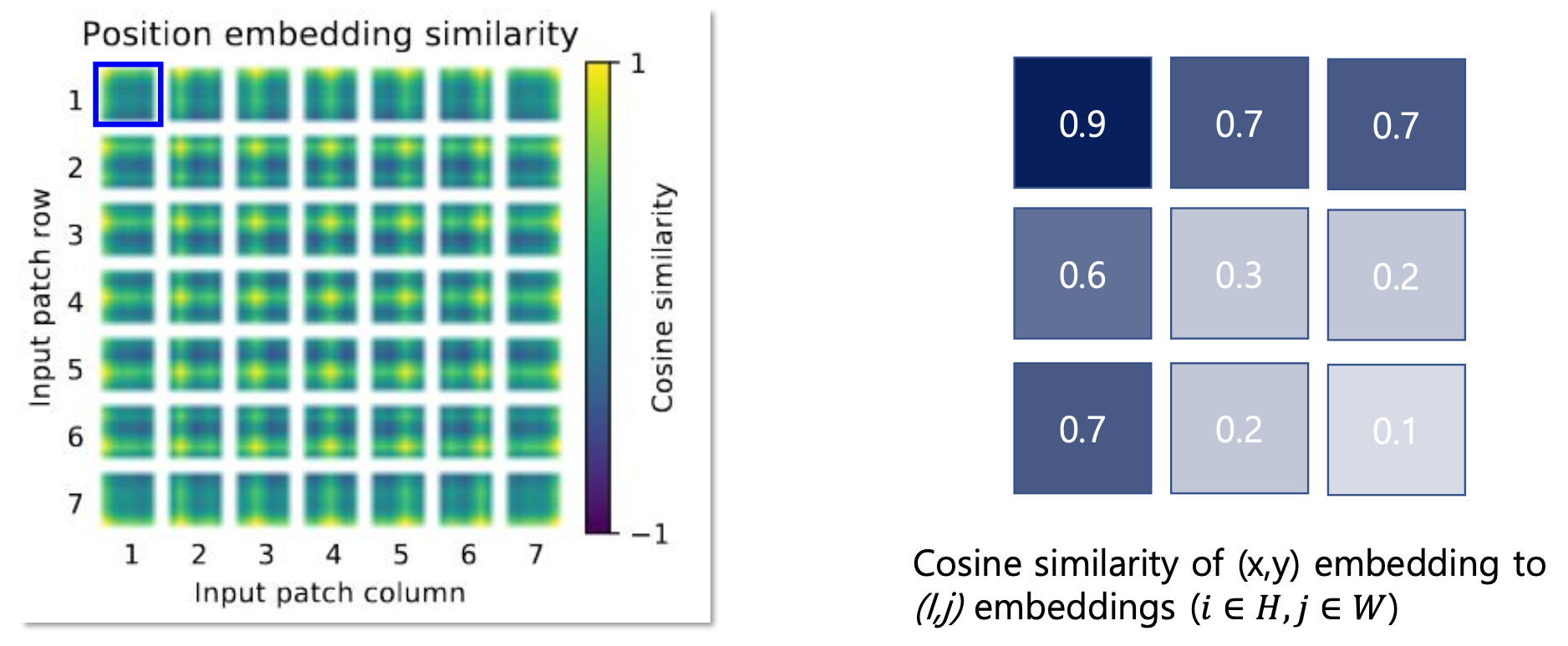 ViT 에서는 positional embedding 도 학습을 했습니다. (이전 Attention 에서는 sine, cosine 을 이용해서 했었습니다.)