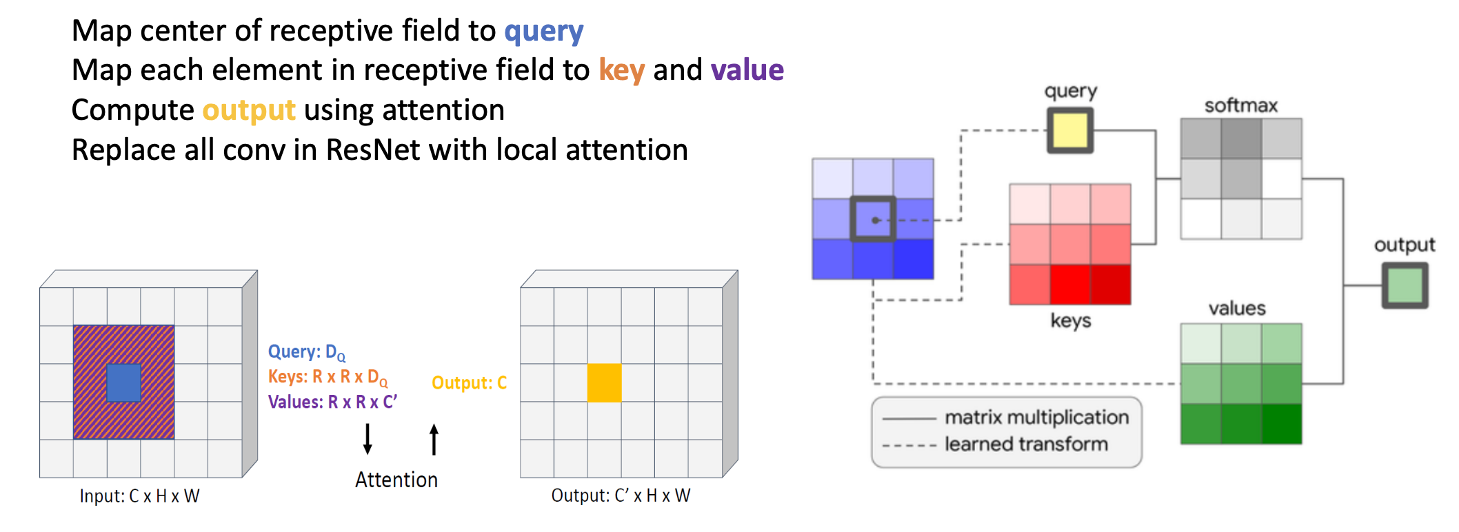 어떤 값을 낼 때 Convolution 을 하는 게 아니라, 가운데 있는 픽셀 값을 Query 로 날리고 Key 는 Fully connected로 학습해서 만들고, Value도 곱해서 만들어서 Self-attention 을 하기는 했습니다.