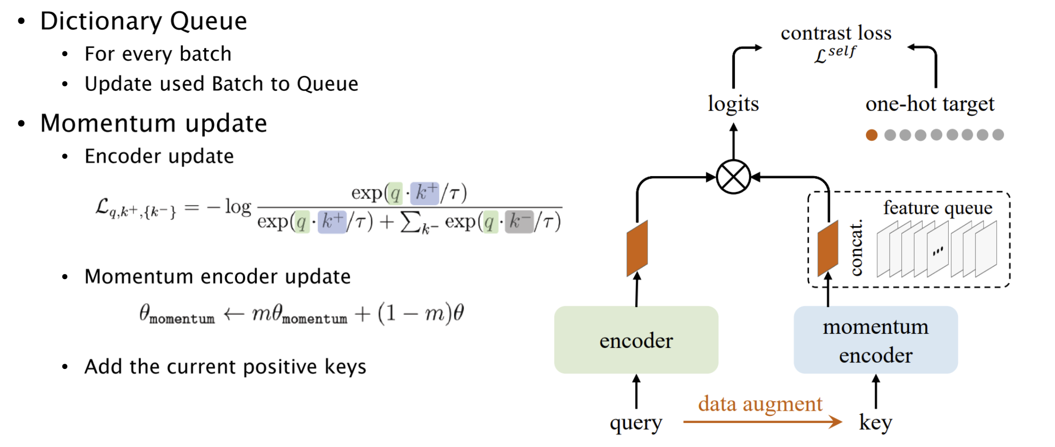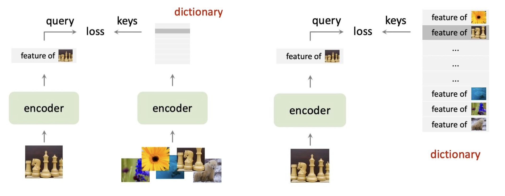 - Query 는 현재 모델로부터 생성되며 Key 는 고정된 Queue 에서 가져옵니다.