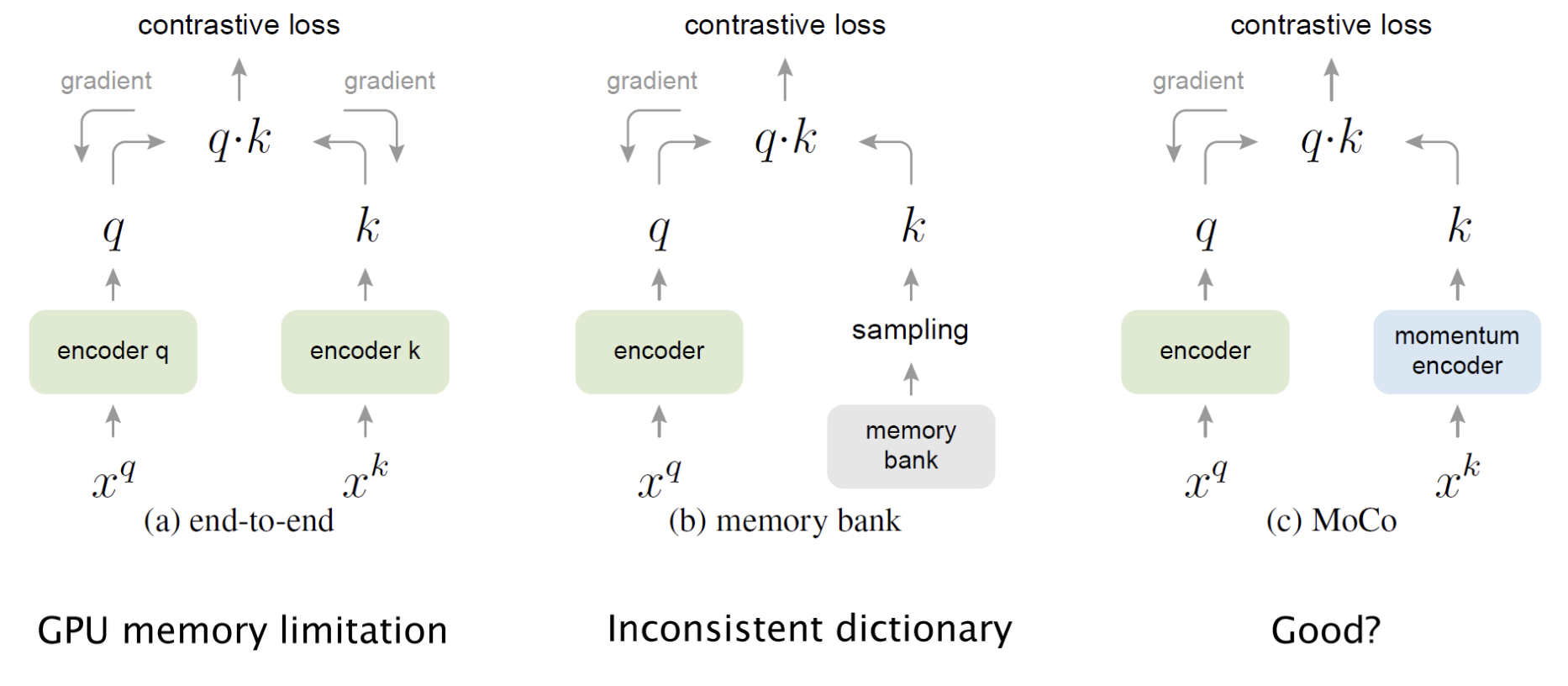 end-to-end 방법과 비교를 하면 end-to-end 방법은 모든 negative 를 encoding 해서 계산을 하는 반면에 momentum 은 내가 지금 하는 거만 올려서 positive 로, 나머지는 negative 로 계산합니다.